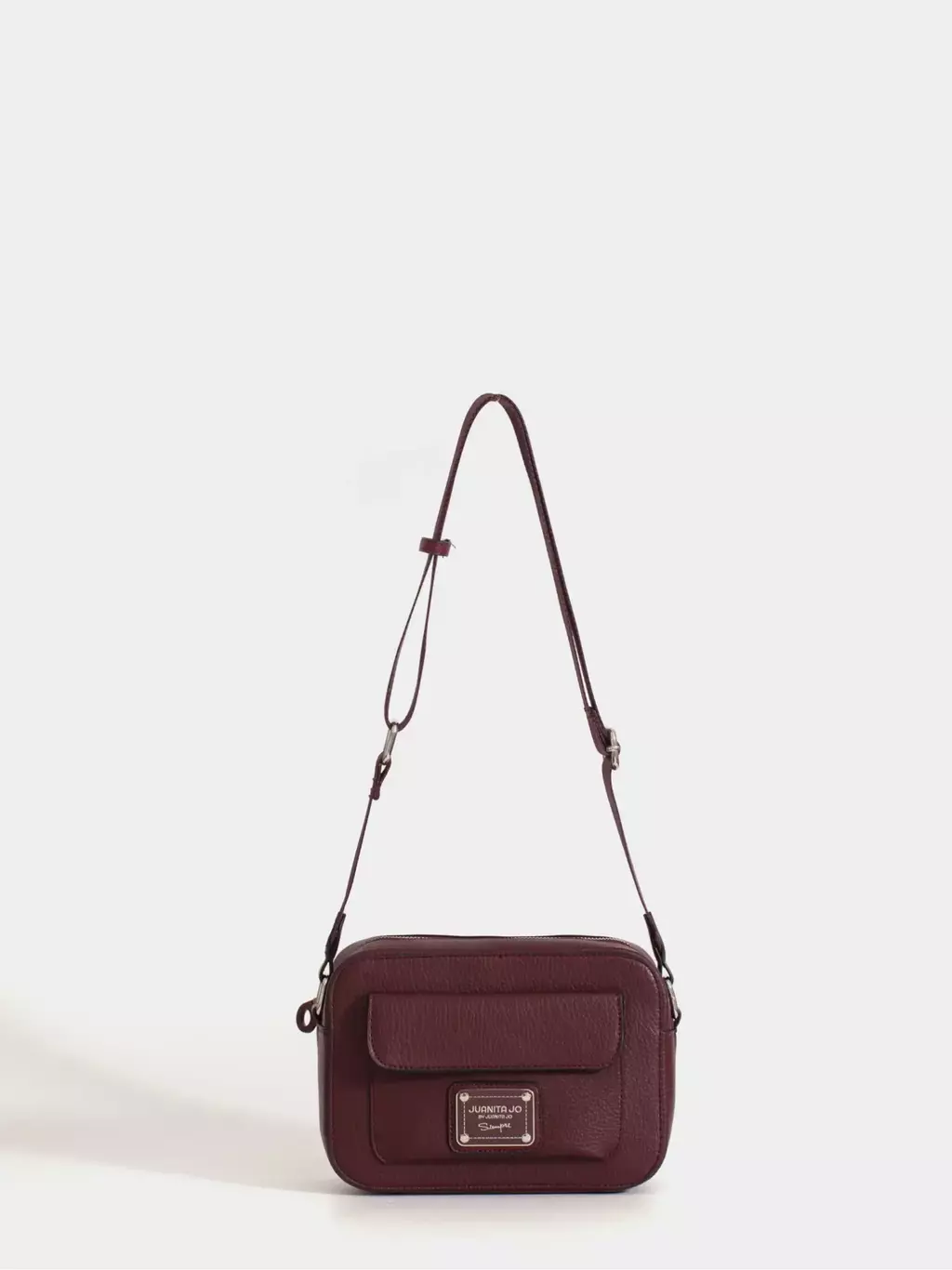 Está confeccionada en material alternativo al cuero y tiene apertura con cierre, bolsillo externo y correa regulable bordada con logo de la marca.