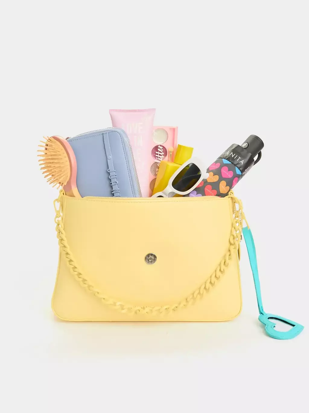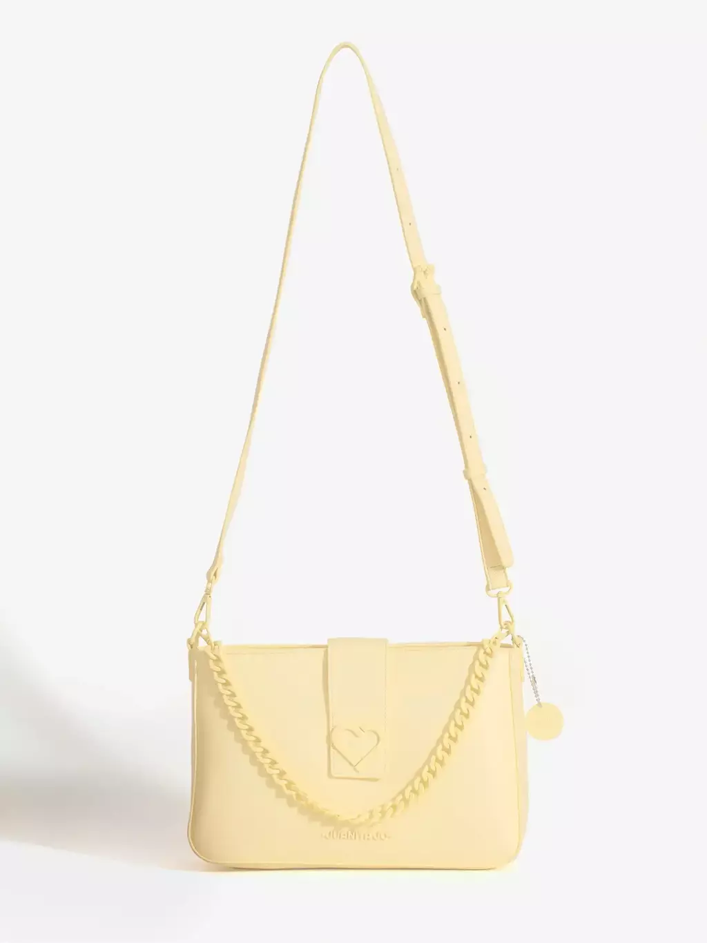 •Cierre superior + solapa con aplique metálico de corazón.