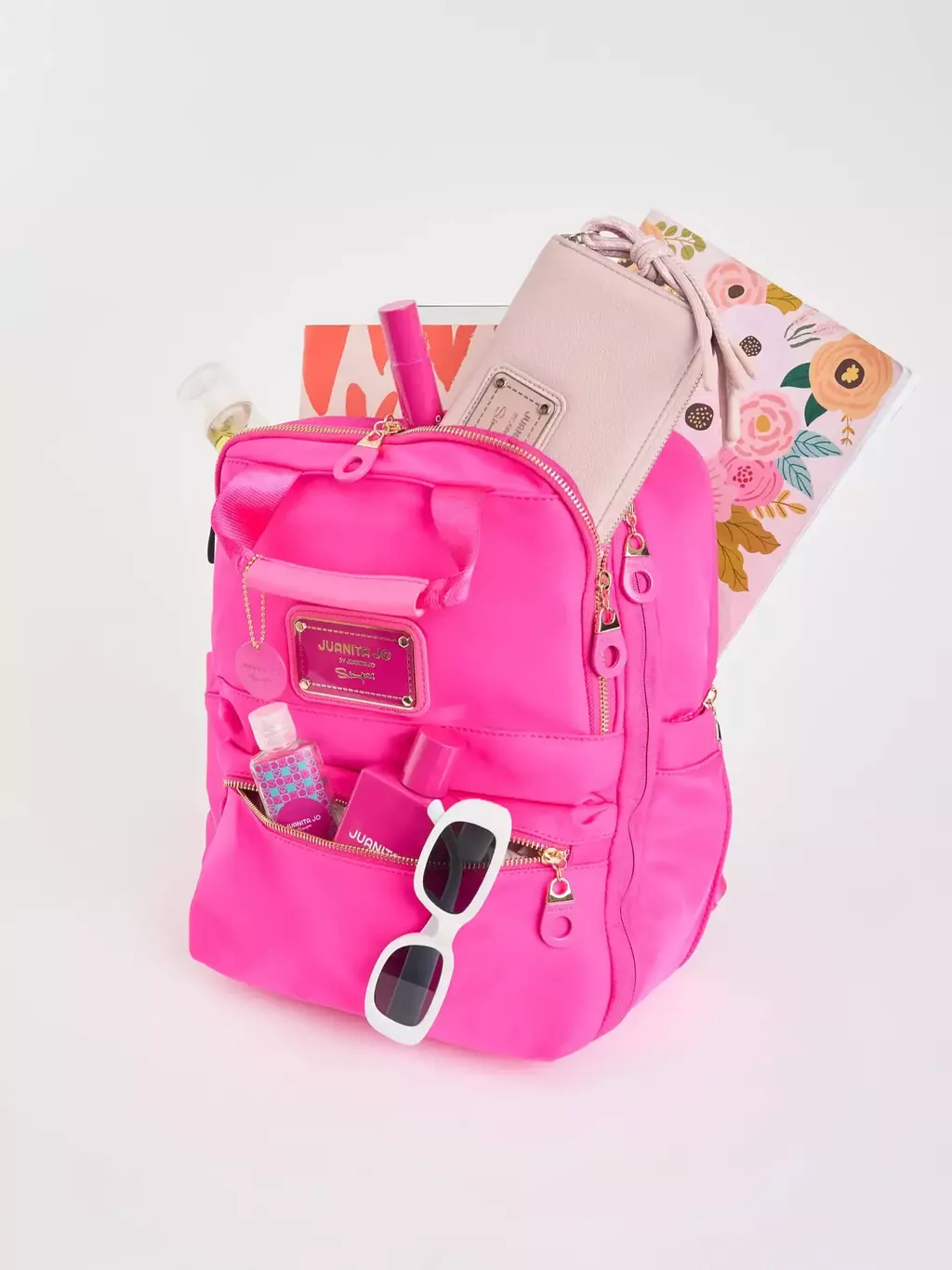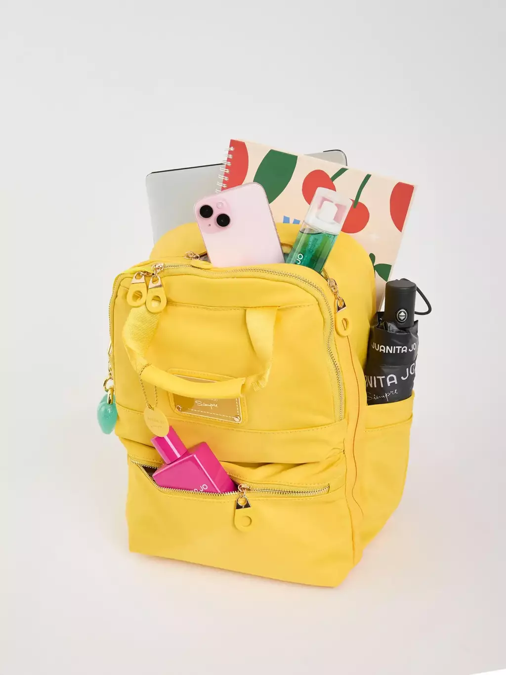 Mochila Amarilla Juanita Jo es pura energía y funcionalidad. Está confeccionada en novytex resistente, su diseño tipo valija con apertura total y elásticos internos te permiten organizar todo sin esfuerzo, asegurando que nada se mueva. Tiene múltiples bolsillos y una faja trasera para valija la convierten en la mejor aliada para escapadas cortas o viajes largos.